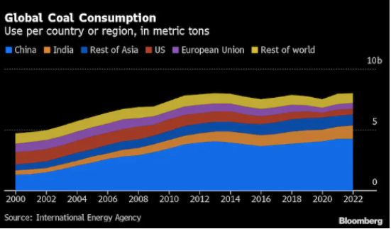 Kohle ist mit Abstand die größte Stromquelle der Welt und erzeugt mehr als 36% davon. Der weltweite Verbrauch begann nach 2018 zu sinken, stieg aber 2021 wieder an und erreichte 2022 ein Allzeithoch und überschritt erstmals 8 Milliarden Tonnen.