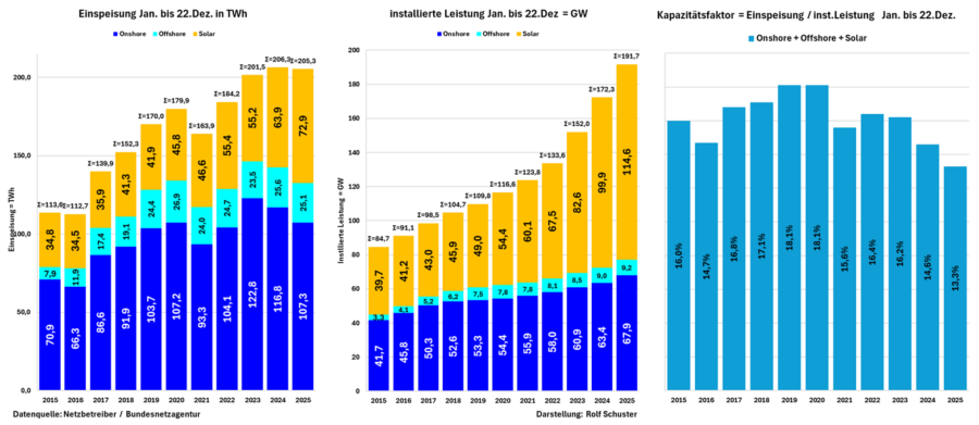 Anhand der von Rolf Schuster [3] erstellten Grafiken zeigt sich, dass trotz zunehmenden Ausbaus der installierten Leistung von Windenergie- und Solaranlagen in der Zeit von 2015 bis 2025 und der im Mittel steigenden Einspeisung (TWh) das Verhältnis von Einspeisung zur installierten Leistung (gleich Kapazitätsfaktor) zwar zunächst ansteigt, seit 2021 aber wieder abnimmt. Daran sind mehrere Ursachen beteiligt: