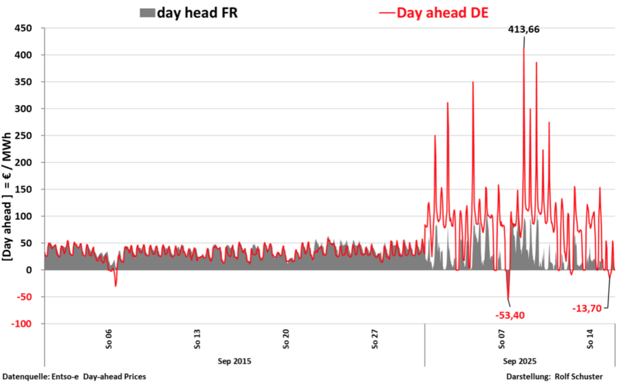 Die gewaltig schwankenden Strompreise an der deutschen Strombörse (im rechten Teil der Abbildung) zum Beispiel an einigen Septembertagen 2025 im Vergleich mit Frankreich (linker Teil) ist Ausdruck der überbordenden Stromerzeugung durch Windenergie-und Solaranlagen. Dieses Bild beschreibt einen Alarmzustand, der dringend Handlungsbedarf erfordert. Die Netzstabilität befindet sich am Limit.