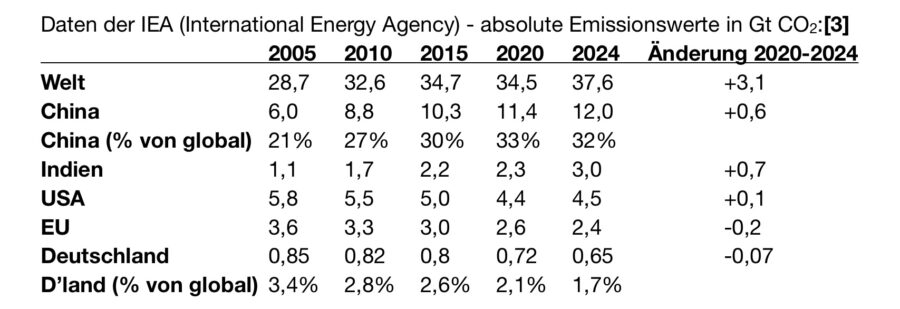 Aufgrund der Energiewende senkt Deutschland jedes Jahr seine CO2 – Emissionen, von 0,85 Gt im Jahr 2005 auf 0,65 Gt im Jahr 2024.[2] Medien und Politik feiern das als Erfolg, es sind sozusagen ihre Erfolgs-Fakten. Fakten sind aber Interpretationen von Daten. Fakten sind meistens emotionsgeladen. Daten sind immer emotionslos. Man benötigt Referenzpunkte zur Beurteilung von Daten, um daraus aussagekräftige Fakten zu konstruieren. Zahlreiche Institutionen liefern sie. Jeder kann sie kennen, wenn man sie kennen will.